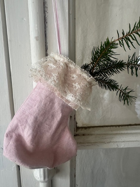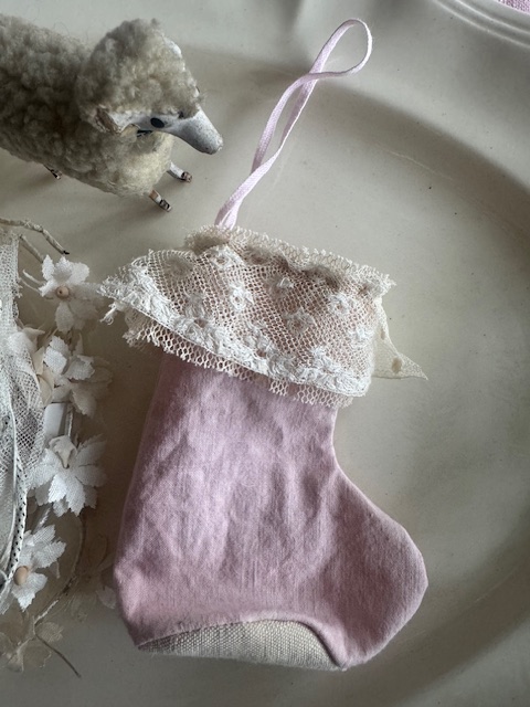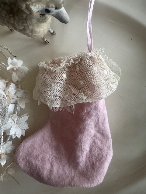 柔らかなリネンに、繊細なアンティークレースをあしらった小さな靴下型のオーナメント。
