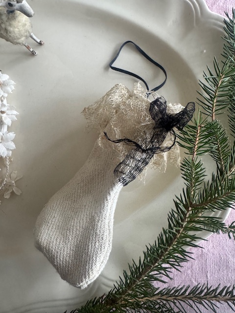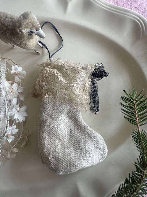 柔らかなリネンに、繊細なアンティークレースをあしらった小さな靴下型のオーナメント。