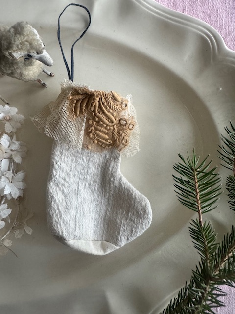 柔らかなリネンに、繊細なアンティークレースをあしらった小さな靴下型のオーナメント。