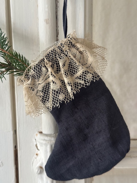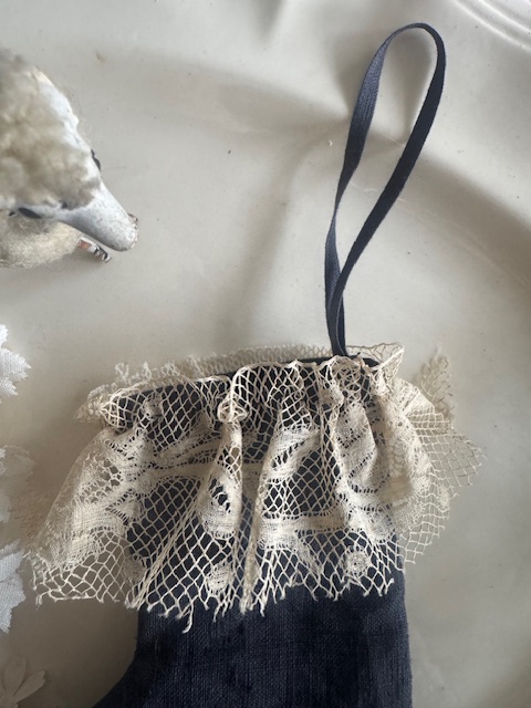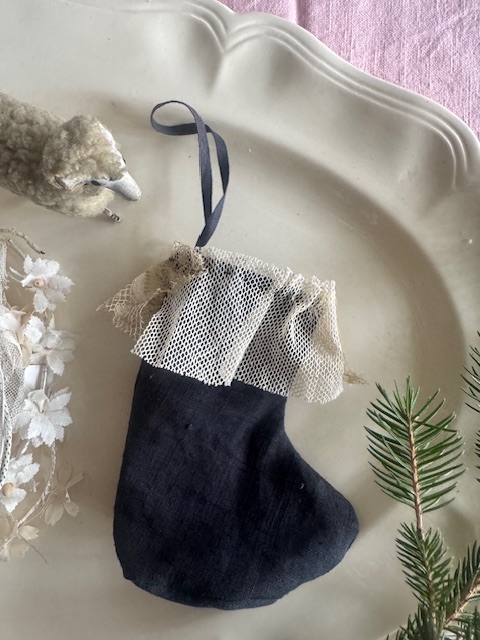 柔らかなリネンに、繊細なアンティークレースをあしらった小さな靴下型のオーナメント。