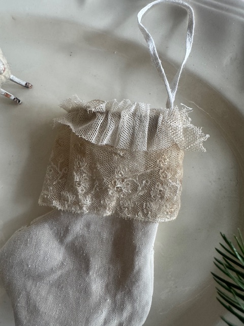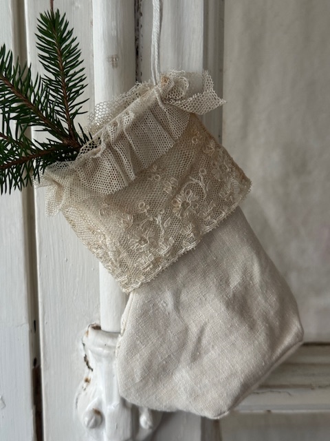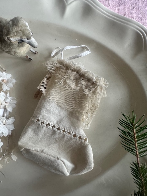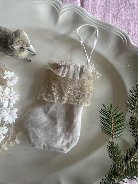 柔らかなリネンに、繊細なアンティークレースをあしらった小さな靴下型のオーナメント。