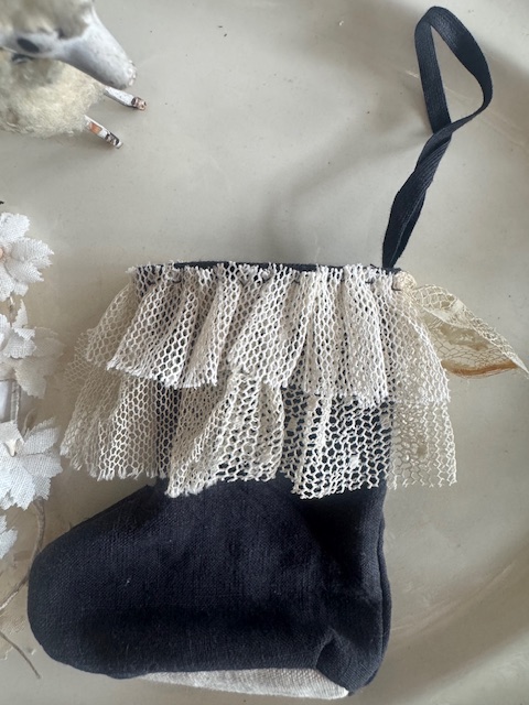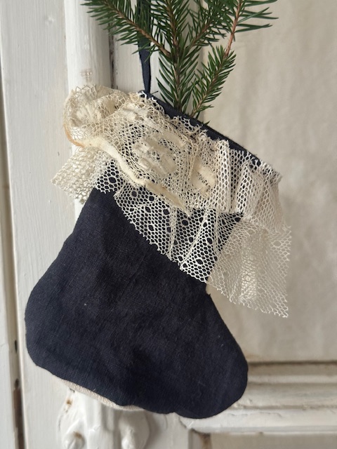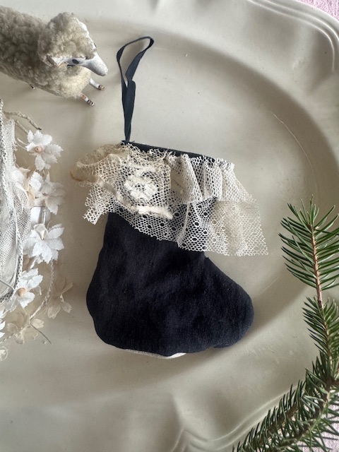 柔らかなリネンに、繊細なアンティークレースをあしらった小さな靴下型のオーナメント。