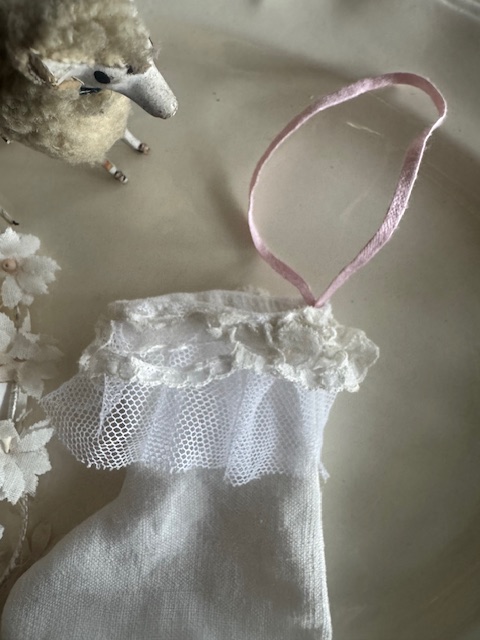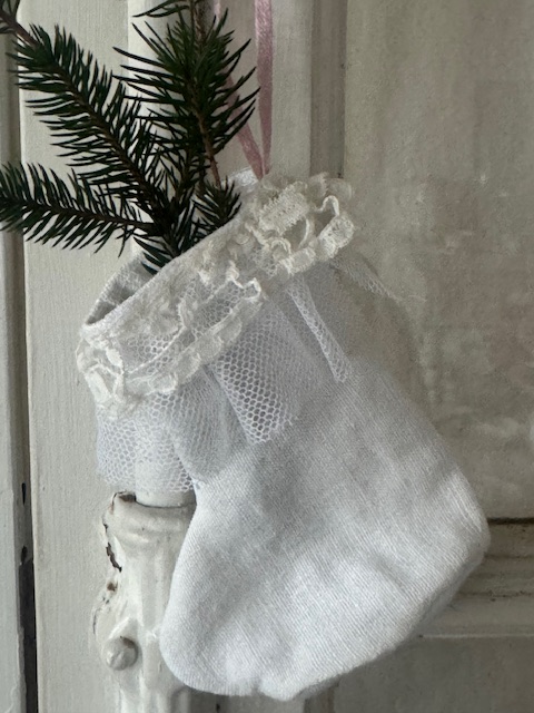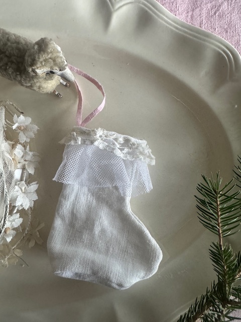 柔らかなリネンに、繊細なアンティークレースをあしらった小さな靴下型のオーナメント。