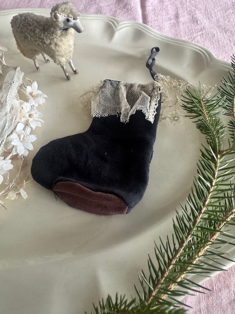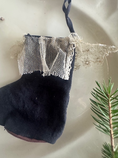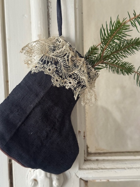 柔らかなリネンに、繊細なアンティークレースをあしらった小さな靴下型のオーナメント。