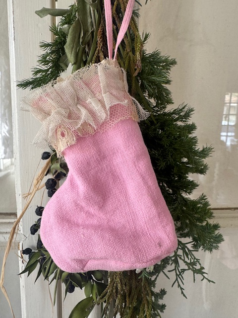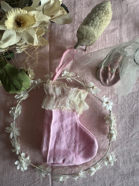 柔らかなリネンに、繊細なアンティークレースをあしらった小さな靴下型のオーナメント。