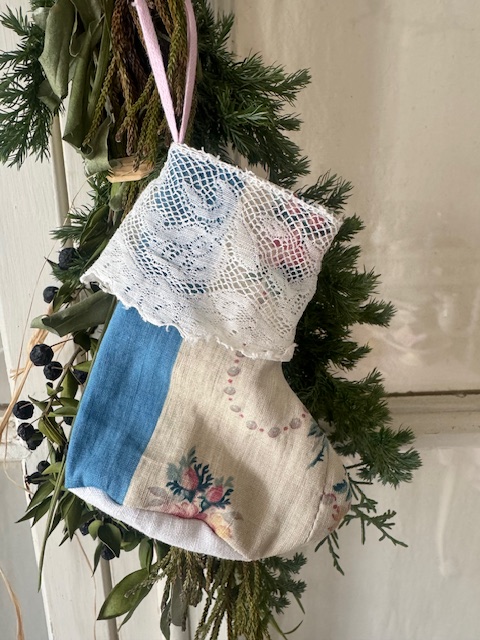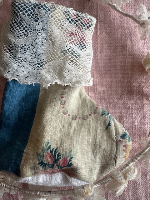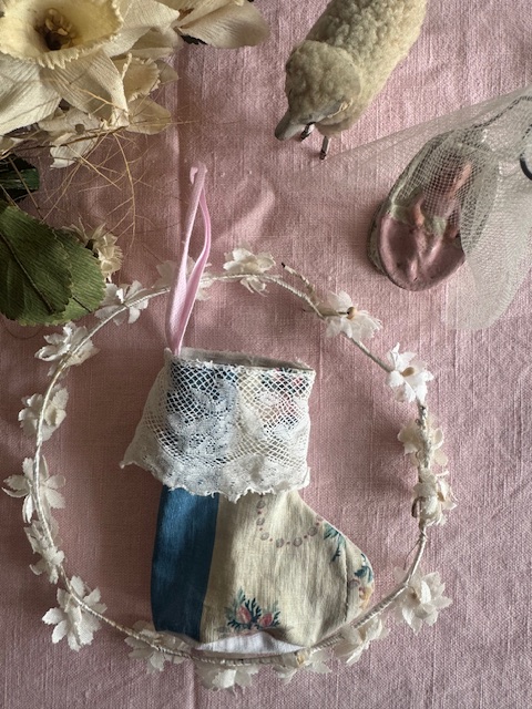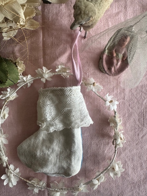 柔らかなリネンに、繊細なアンティークレースをあしらった小さな靴下型のオーナメント。