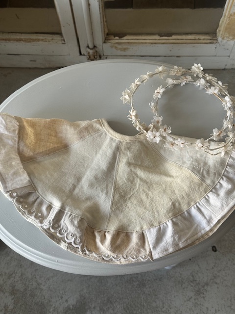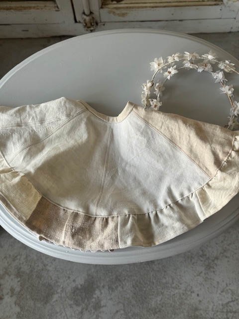当時の手仕事ならではの素朴なステッチやティッシュ―(ティッシュ生地)のフリルが贅沢にあしらわれ柔らかなリネンの微妙なトーンが美しくパッチワークされています。