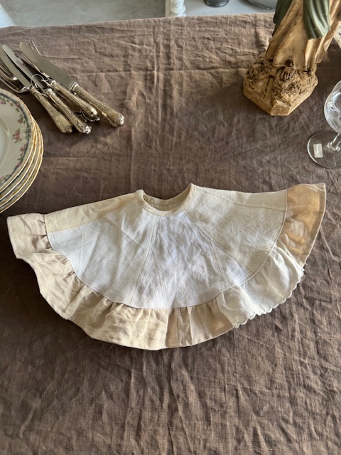 当時の手仕事ならではの素朴なステッチやティッシュ―(ティッシュ生地)のフリルが贅沢にあしらわれ柔らかなリネンの微妙なトーンが美しくパッチワークされています。
