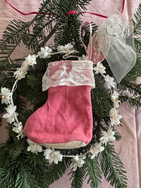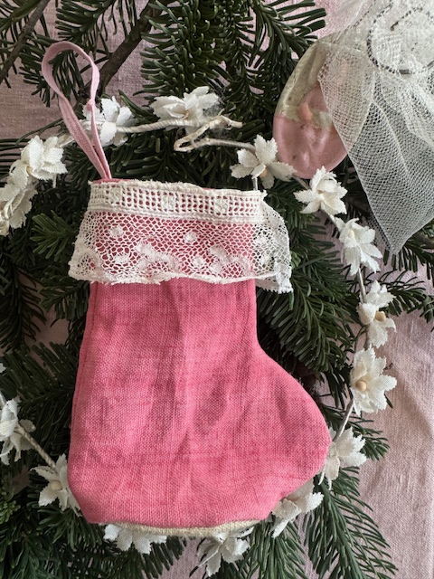 柔らかなリネンに、繊細なアンティークレースをあしらった小さな靴下型のオーナメント。