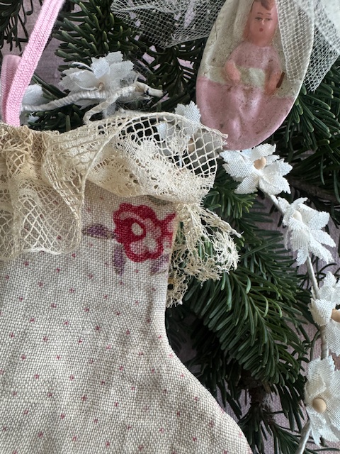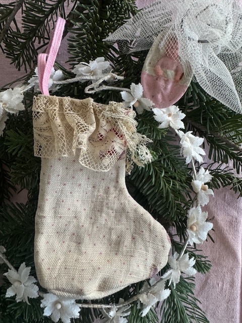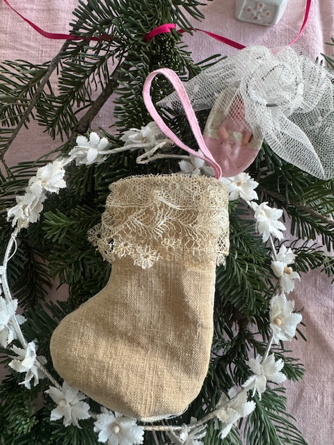 柔らかなリネンに、繊細なアンティークレースをあしらった小さな靴下型のオーナメント。