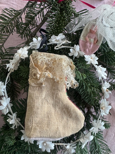 柔らかなリネンに、繊細なアンティークレースをあしらった小さな靴下型のオーナメント。