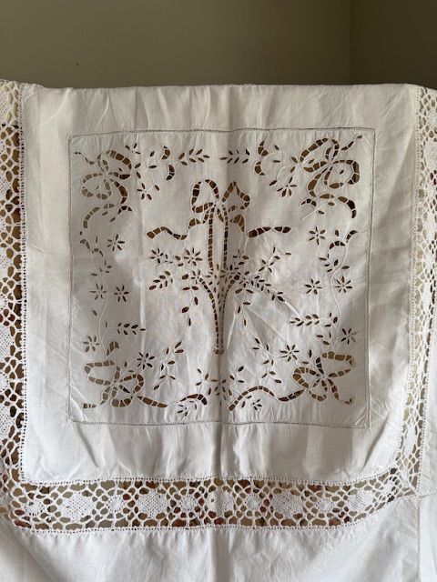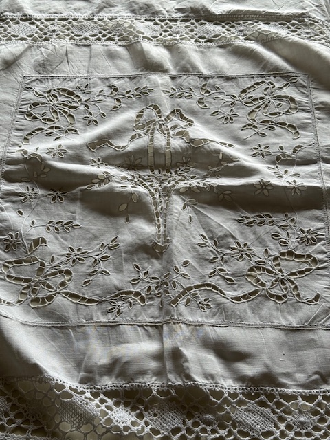 四隅にも可愛らしいリボンのカットワークがあしらわれ当時の職人技の細やかさを存分に味わえる特別な一枚です。