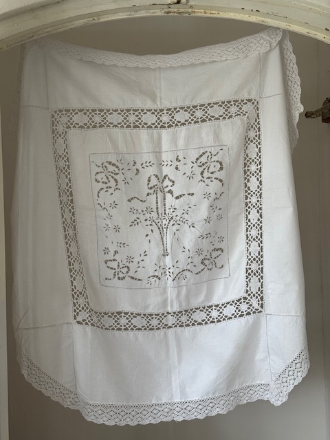 中央のフラワーバスケットのモチーフが施されている部分まではすべて上質なリネンで仕立てられております。