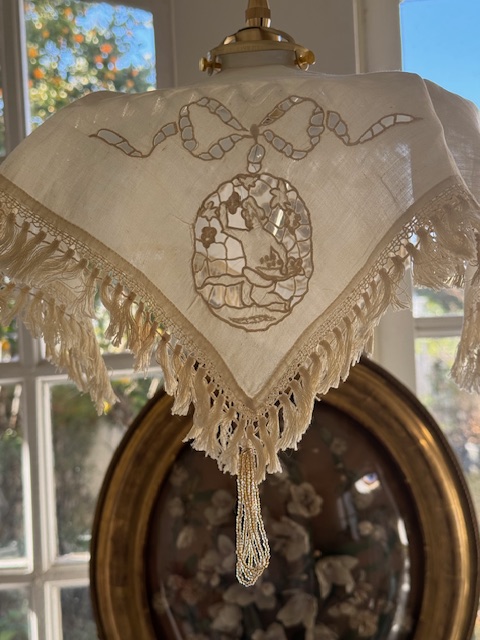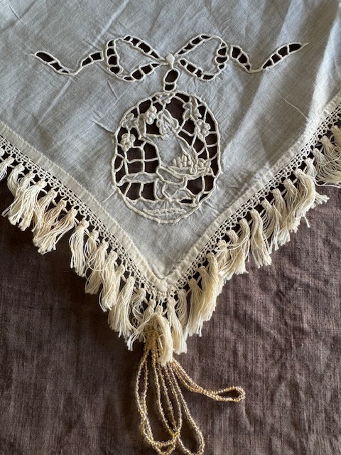 リボンモチーフの下には人物をかたどった大変細かな手刺繍のモチーフが2箇所。
