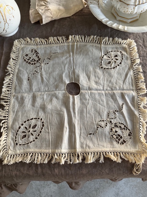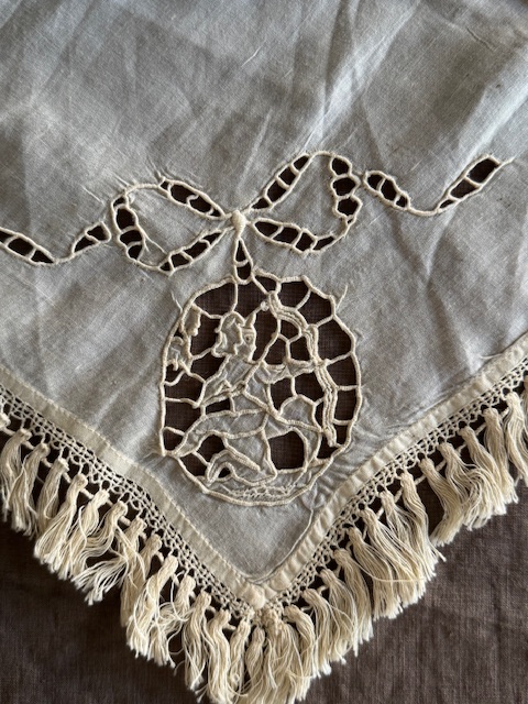 周囲には細やかなフリンジがぐるりと施され平置きにすると四隅には手仕事によるカットワークが美しく配置されています。