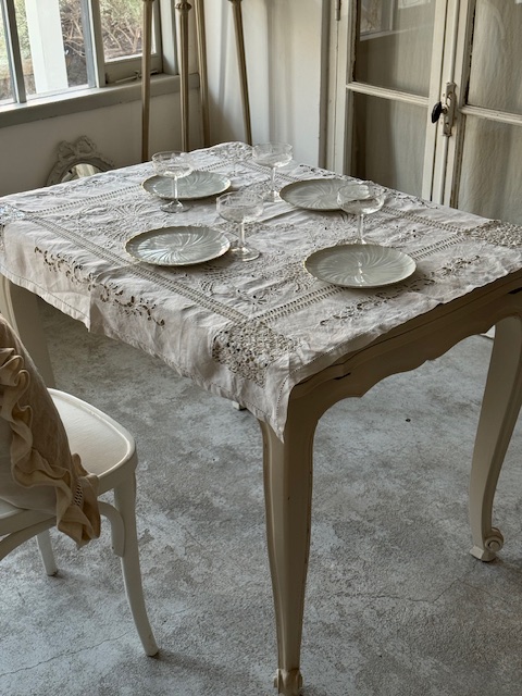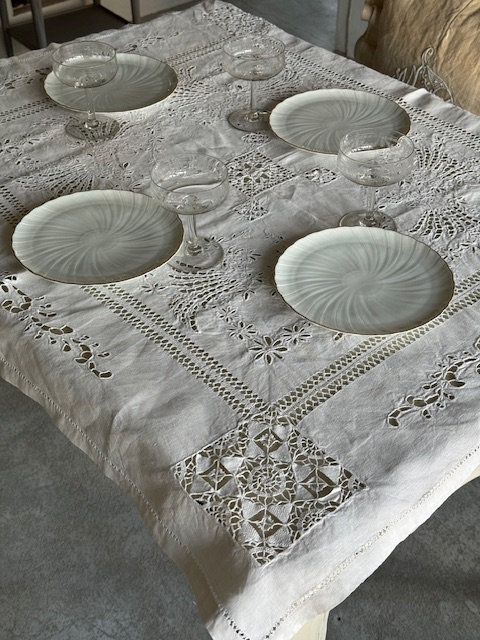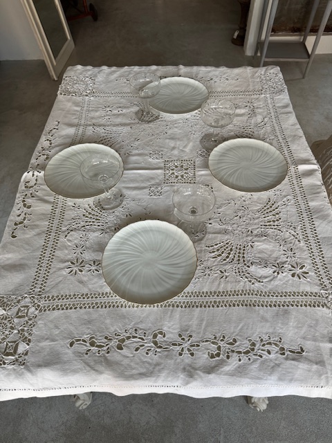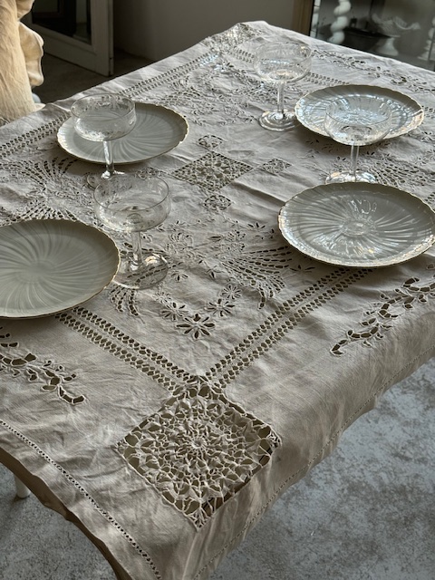 1900年初頭のフランスアンティーク大変手仕事の込んだリネンテーブルクロス。