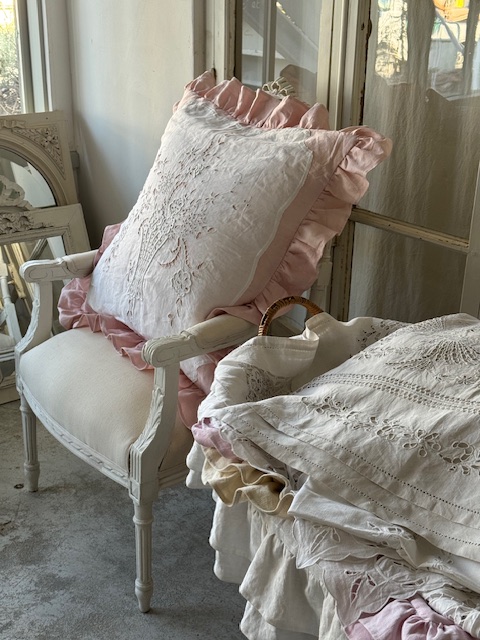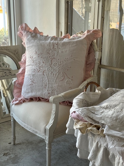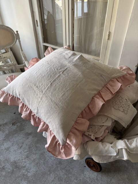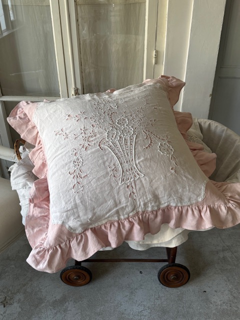 フリルがあしらわれたやさしいベビーピンクトーンの1900年初頭のフランスアンティークリネンを使用。