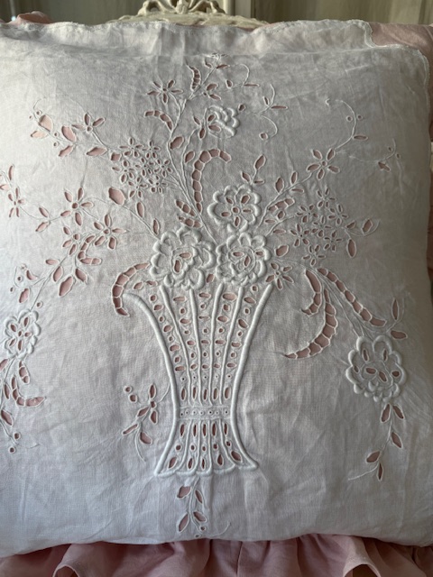 中央には立体感あふれるフラワーバスケットモチーフのドロンワーク刺繍が贅沢に施されており当時の高度な手仕事の美しさを存分に感じていただけます。