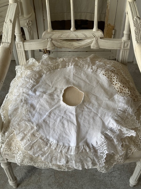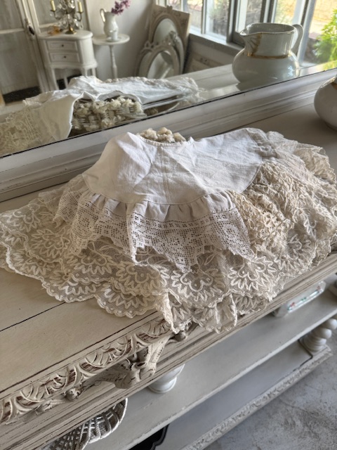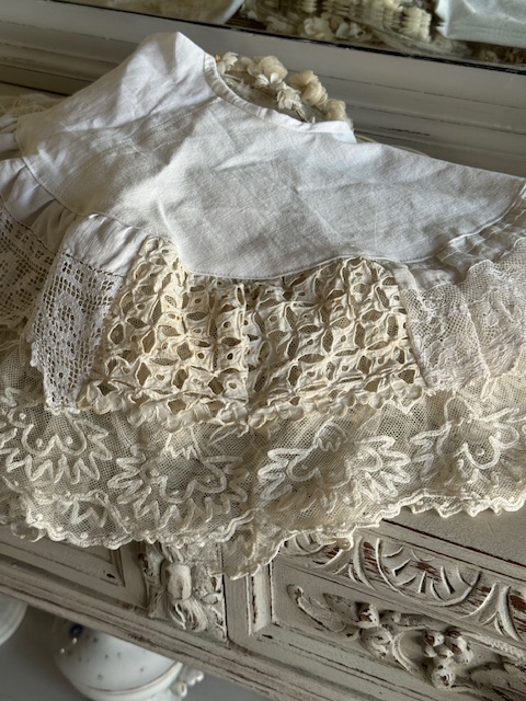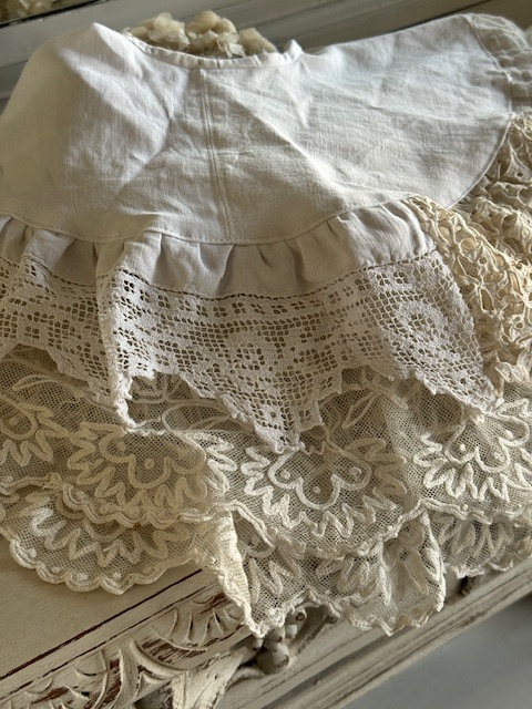 本体部分には当時の上質なアンティークリネンを使用し周囲にはチュールレースや細やかな手仕事が施されたレースパーツをふんだんにあしらっています。