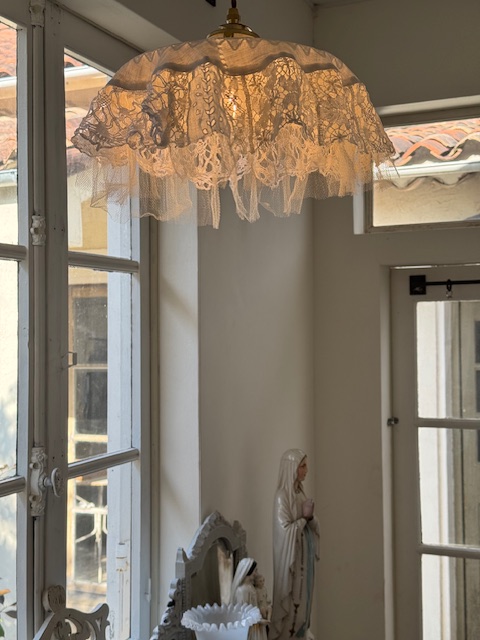 フランスアンティークのやわらかなベージュのチュールに美しいドレープを重ね1900年初頭の手仕事による繊細なアンティークレースをふんだんに用いて仕立てられた特別なシェードカバーです。
