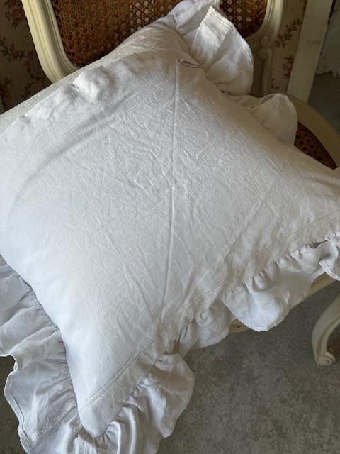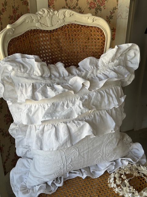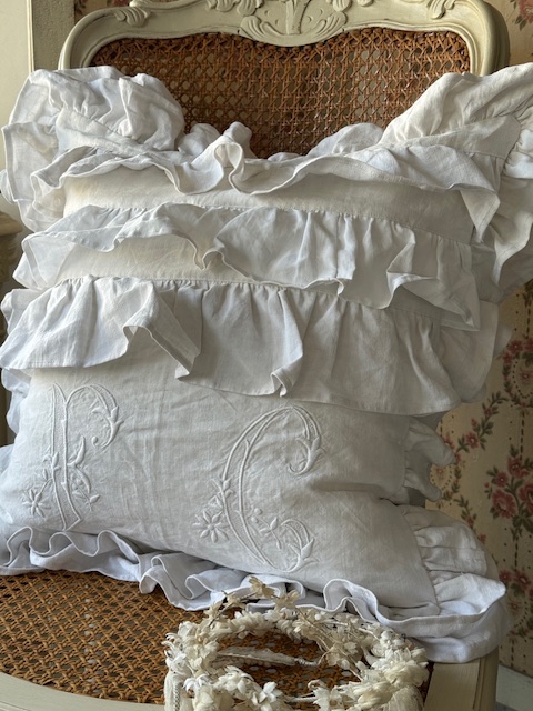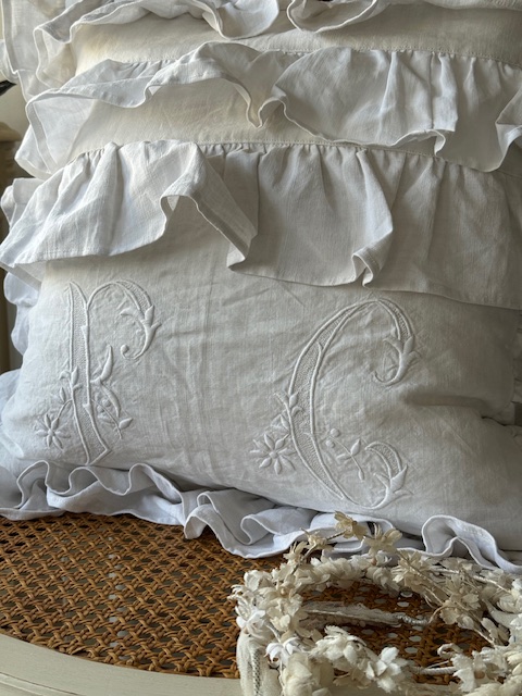 1900年初頭のフランスアンティークリネンを贅沢に使用したフリル付きイニシャルクッションカバー。