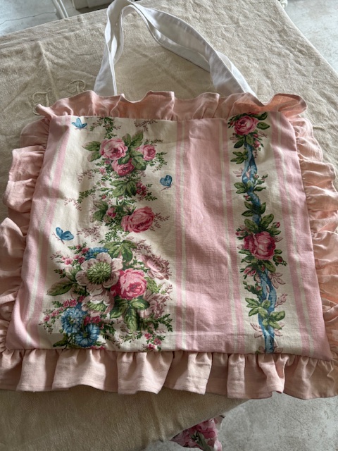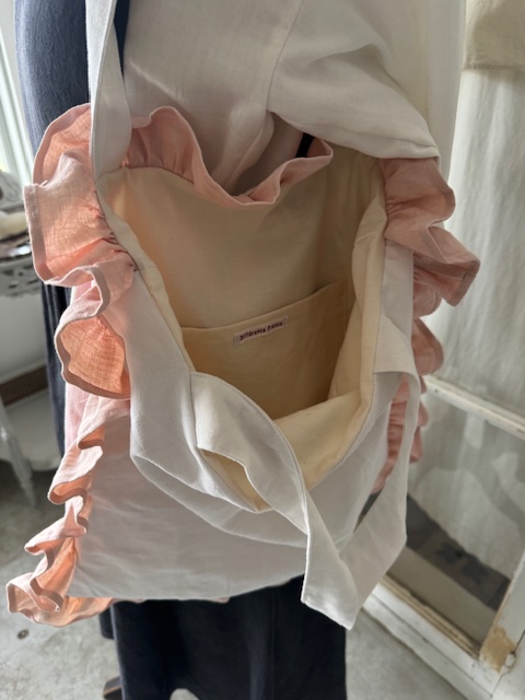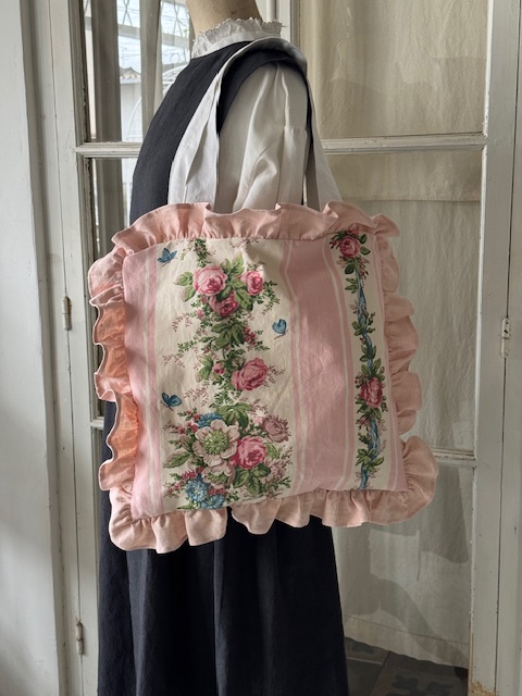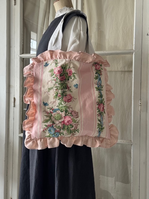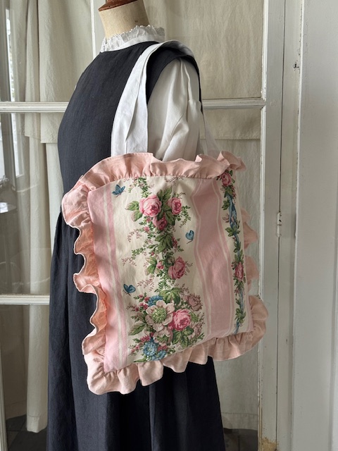 1900年初頭のフランスアンティークファブリックを贅沢に使用した華やかなフリル付きバッグです。