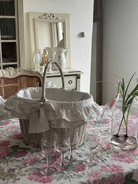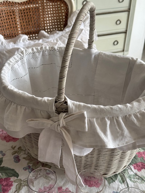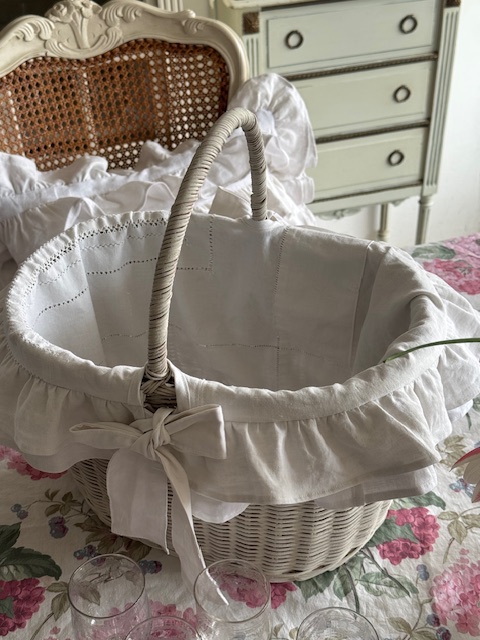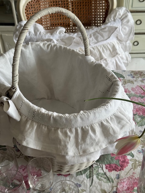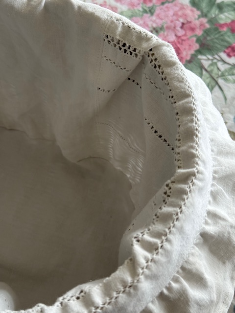1900年初頭のフランスアンティークホワイトリネンカバーを使用したパニエ。