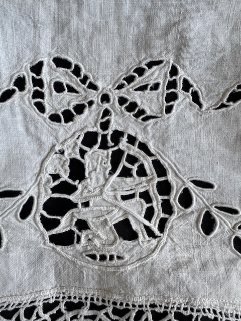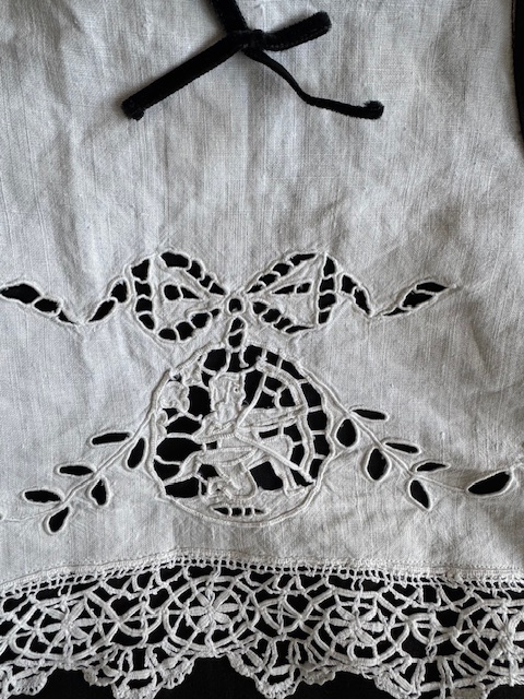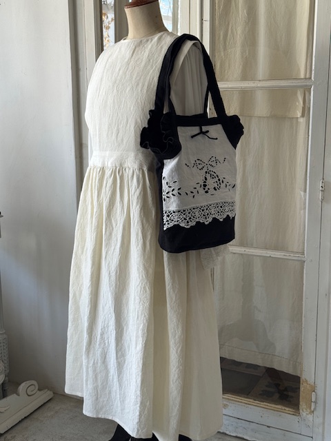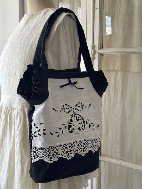 1900年初頭のフランスアンティークリネンの手刺繍が美しく浮かび上がるバッグ。