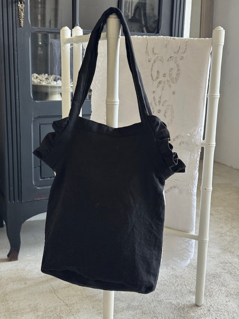 本体にはしっかりとした質感のベルギー産ブラックリネンを使用し表面には1900年初頭のフランスアンティークリネンを贅沢にあしらいました。
