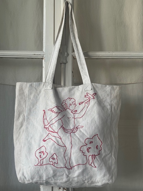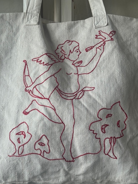 表面には、当時のデザインをもとにした天使が矢を放つモチーフの手刺繍ステッチが施されています。