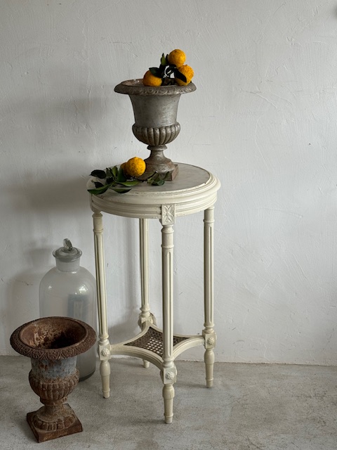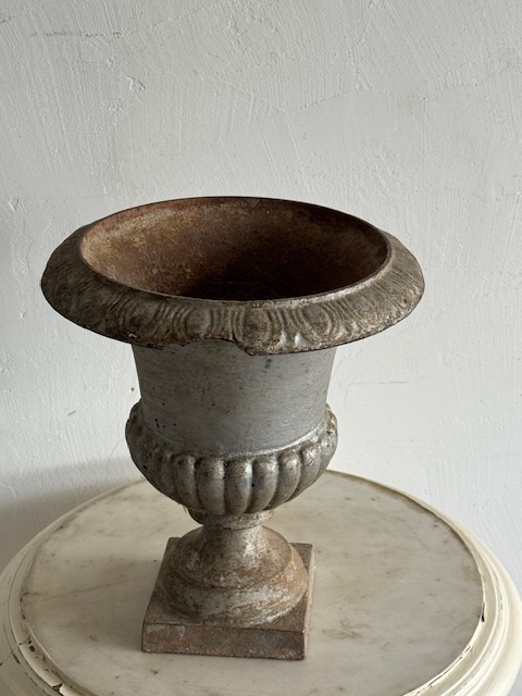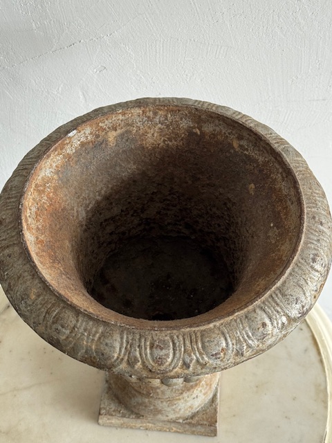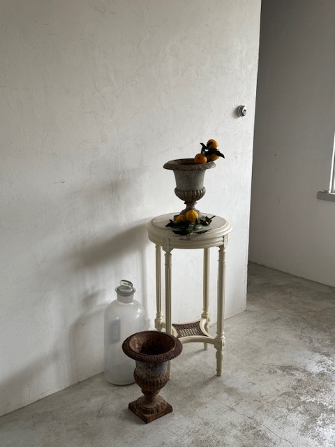 重厚感のある鋳物ならではの質感と下部にかけて丸みを帯びた優雅なシルエット、そしてクラシカルな装飾が大変美しく、長い年月を経たアンティークならではの深みを感じさせます。