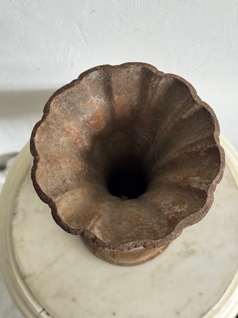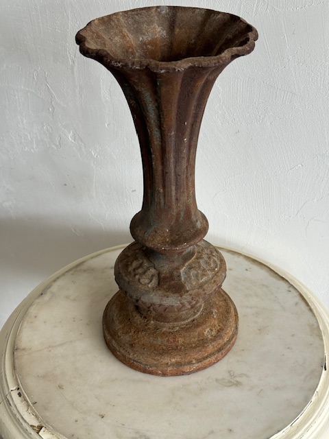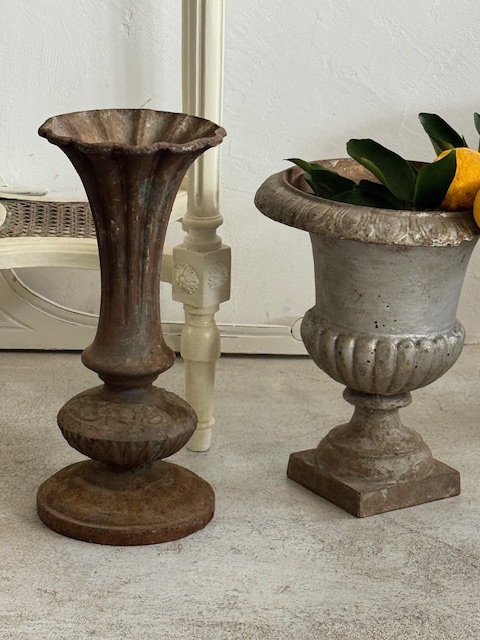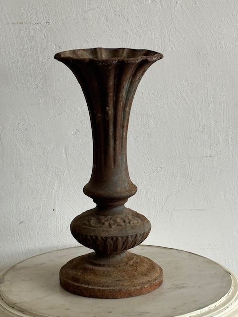 クラシカルな縦のラインが際立つシルエットに口縁や土台部分には繊細で重厚感のある装飾が施されており当時のフランスらしい優雅さと存在感を強く感じさせるお品です。