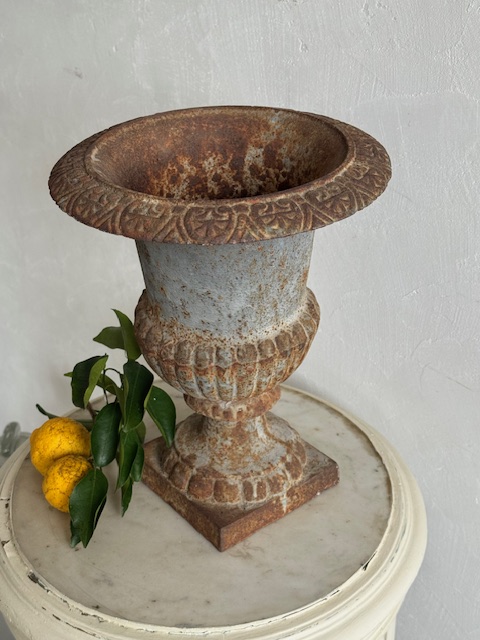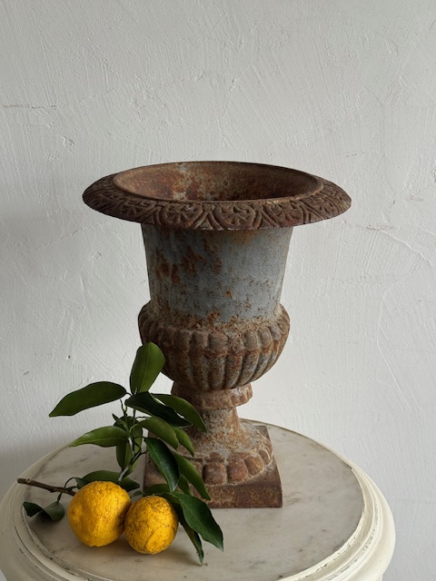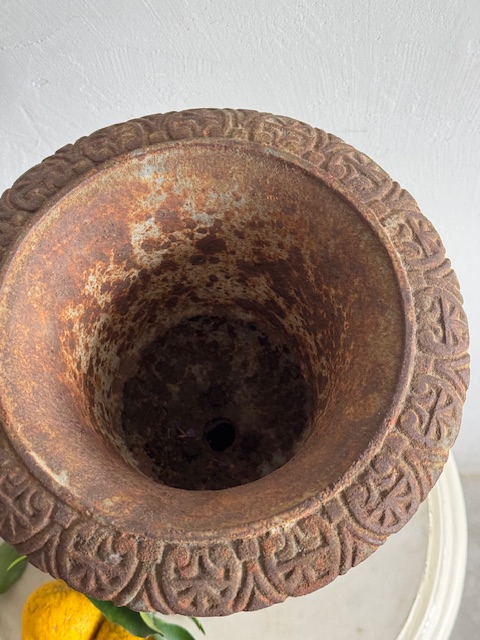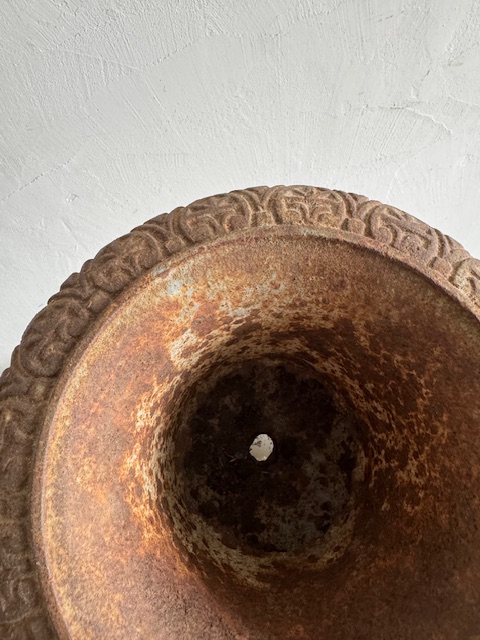 長い年月を経て生まれた自然な錆の表情と口縁やボディに施された繊細なレリーフ装飾が静かで品のある存在感を放っています。