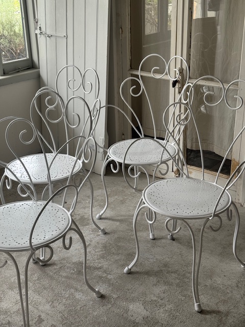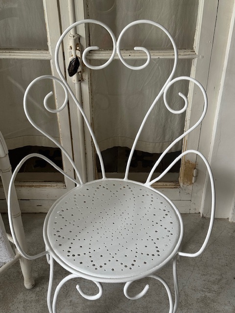 フランスアンティークのホワイトのアイアンガーデンチェア。