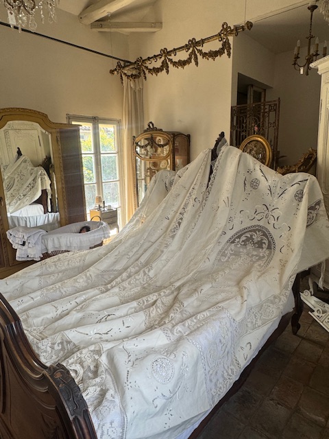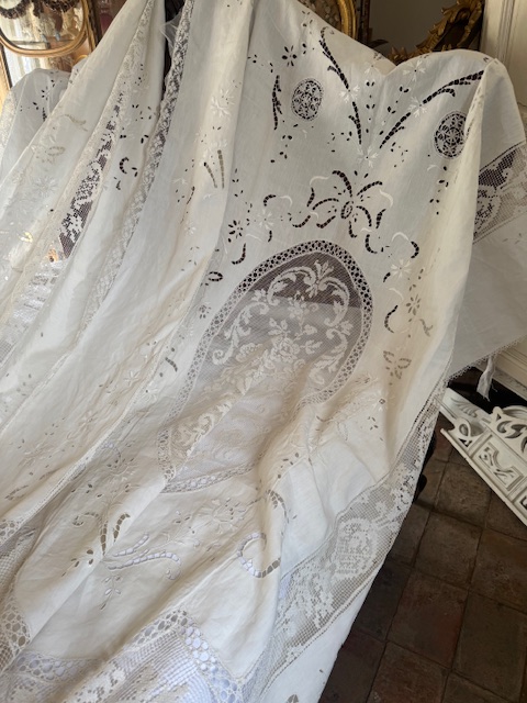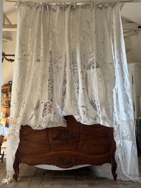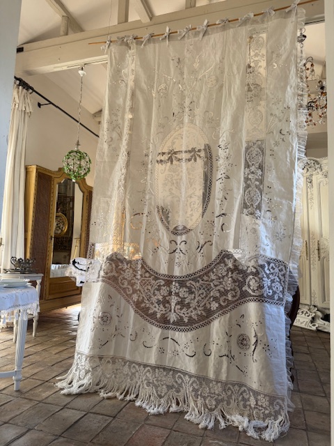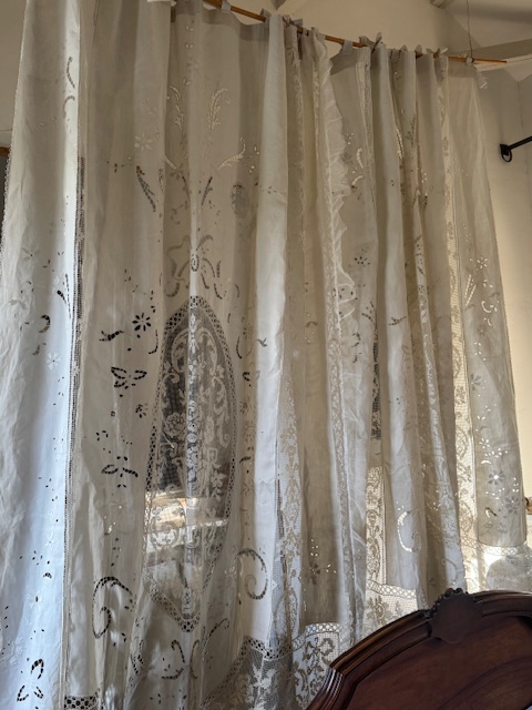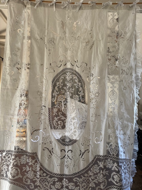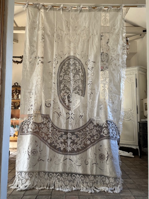 非常に貴重な手仕事がふんだんに施された観音開きのリネン・カーテンです。