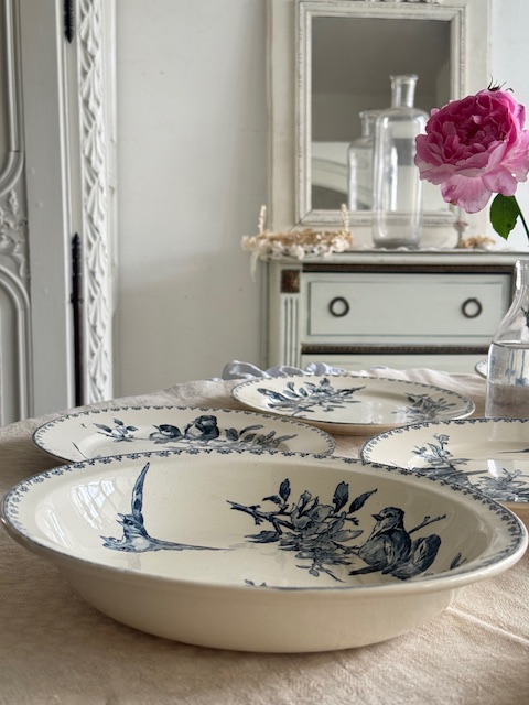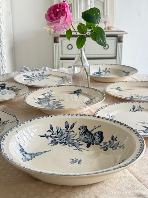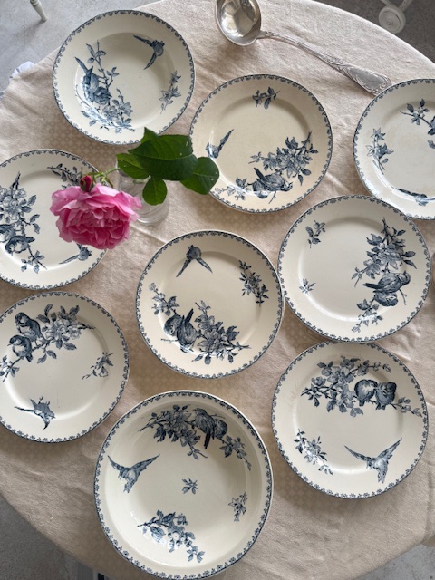 繊細なブルーの絵柄で小鳥や植物が優しく描かれておりテーブルを上品に彩ってくれるお品です。