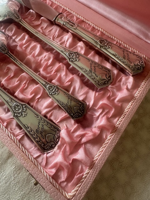 持ち手には繊細な装飾とともに「Marie-José(マリー・ジョゼ)」の名が刻まれており特定の方のために誂えられた贈答用のカトラリーと考えられます。