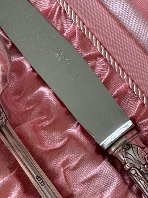 すべてにシルバーのホールマークが刻まれておりナイフのブレード部分には「Inox(ステンレス)」の刻印が入っています。
