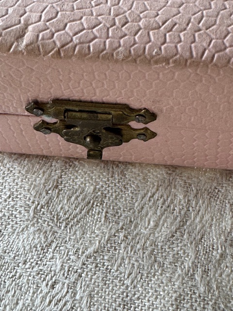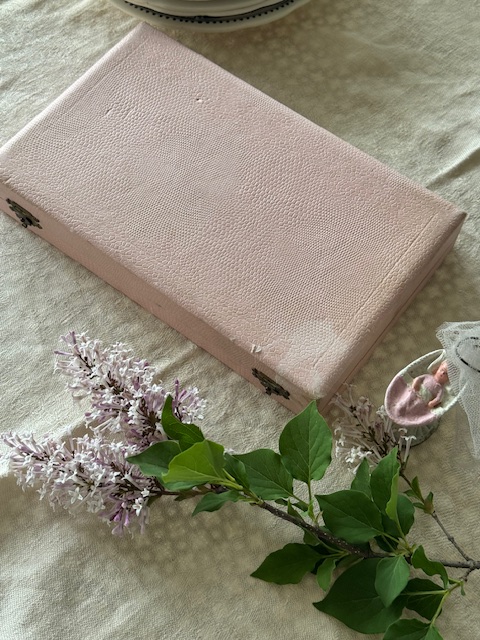 型押しのピンクのボックスに収められたお品で内側にはサテン生地が張られ開けた瞬間に当時の贈り物の華やかさが感じられます。