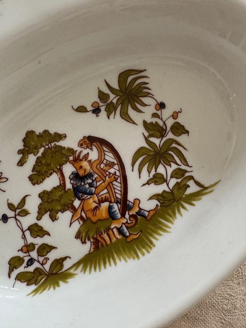 やわらかな白磁にムスティエらしい繊細で物語性のある絵付けが施されており各スペースごとに異なるシーンが描かれています。