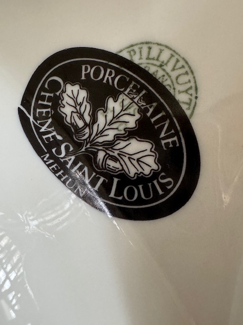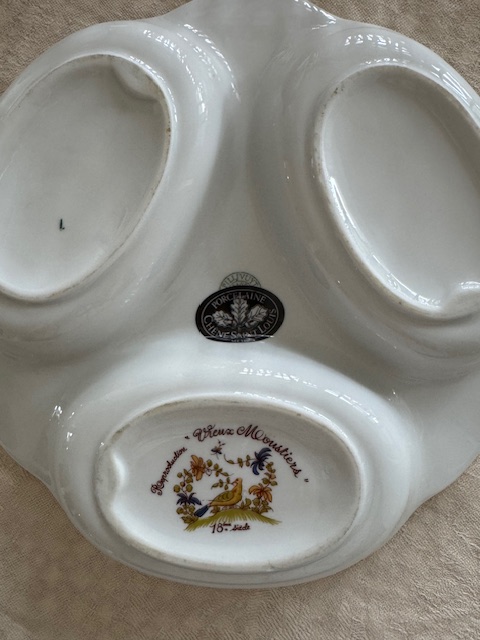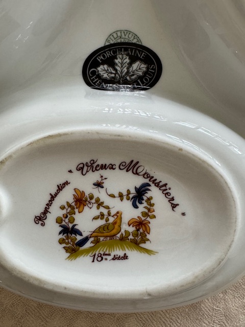 裏面には「Porcelaine Chêne Saint Louis」のシールと「Vieux Moustiers」の刻印が確認できるお品です。