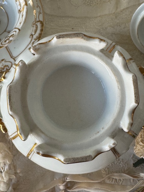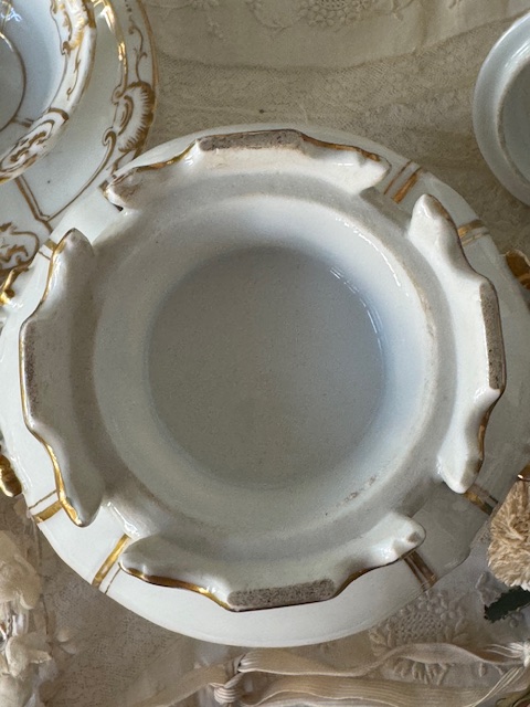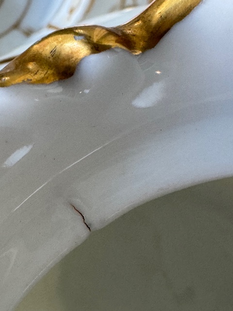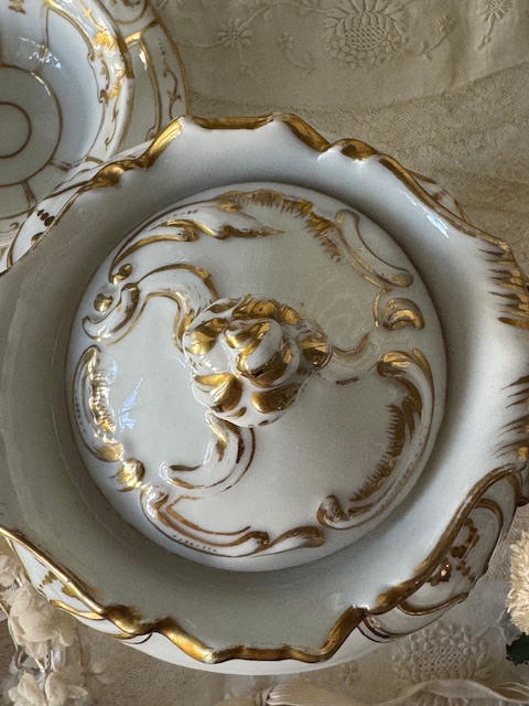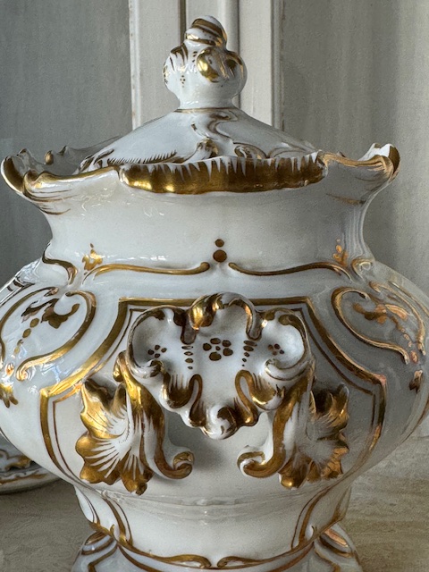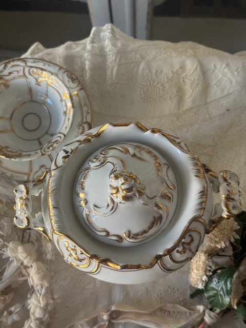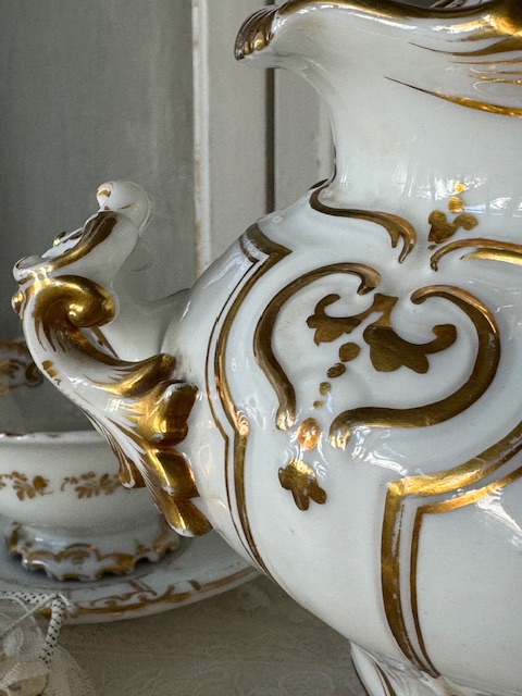 ロカイユ装飾が立体的に浮かび上がり、金彩の陰影が光を受けて美しく映えます。