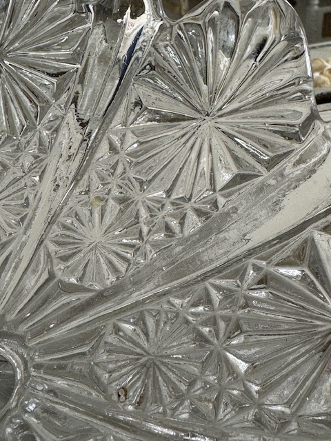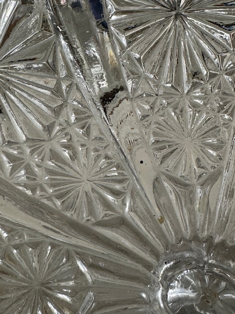 繊細なカット模様が美しく広がるガラスにところどころに見られる気泡がアンティークならではの温かみを感じさせてくれるお品です。