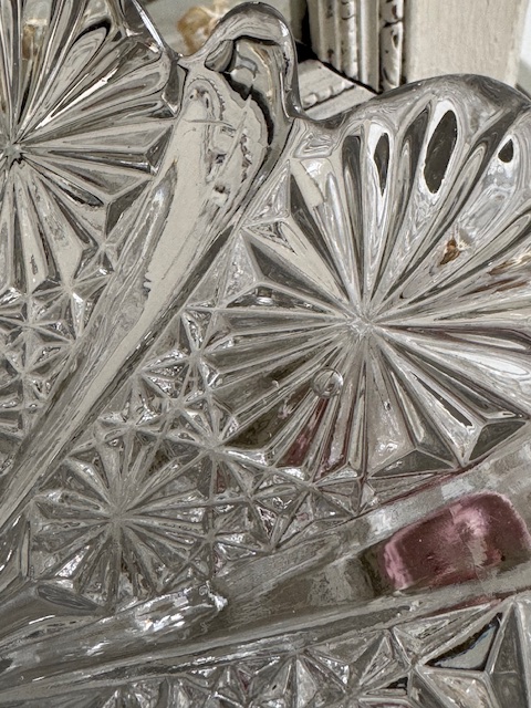 繊細なカット模様が美しく広がるガラスにところどころに見られる気泡がアンティークならではの温かみを感じさせてくれるお品です。