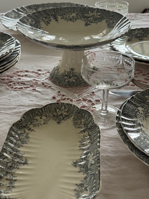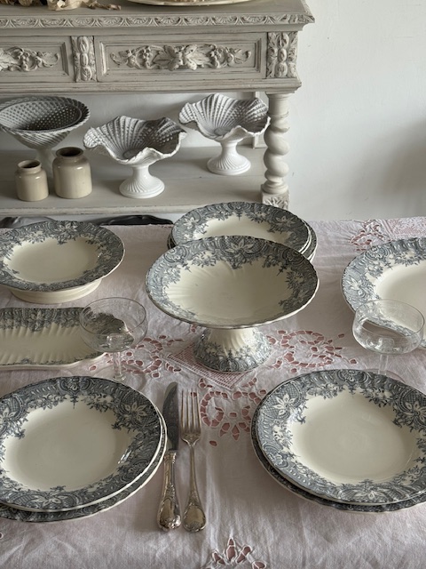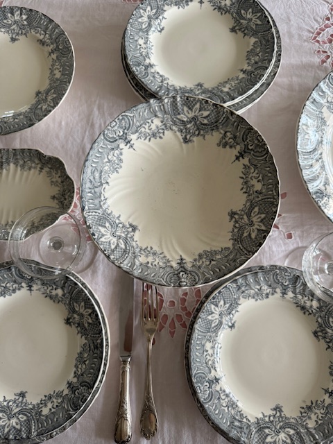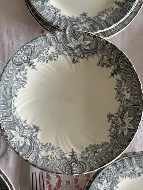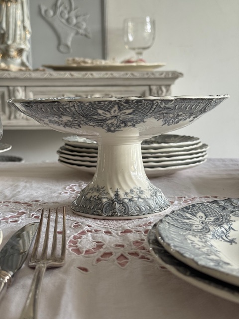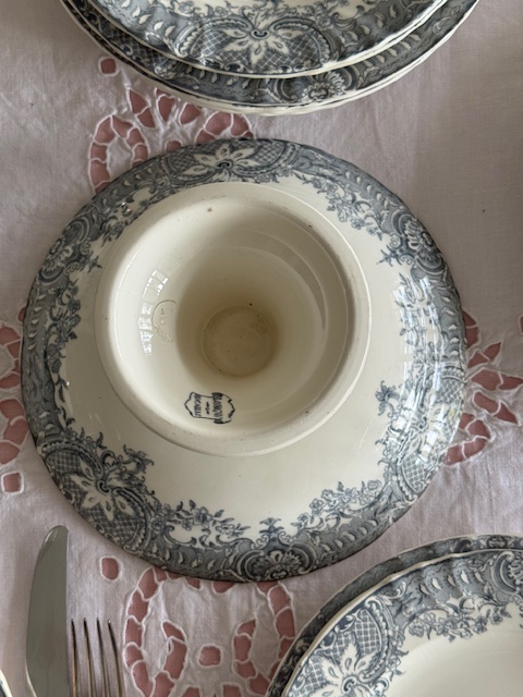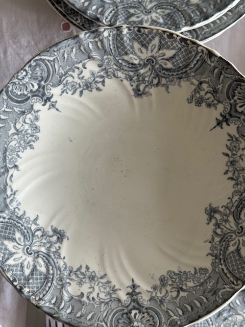 縁まわりには薄いグレーブルーの優しい色味で繊細な装飾が施されており、内側には製造当時のインク飛びがわずかに見られますがアンティークならではの魅力としてお楽しみいただける範囲です。