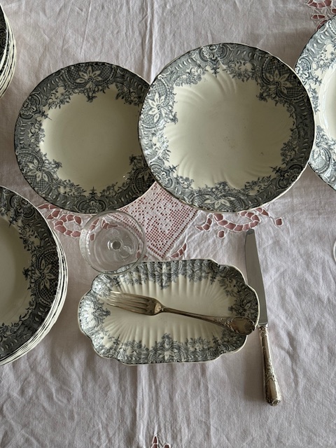 縁には繊細なロカイユ装飾と花々がグレーブルーの優しいトーンで描かれ中央に向かってラインが放射状に伸びるようなレリーフのモチーフが大変美しくシリーズの中でも特に表情豊かなデザインとなっています。