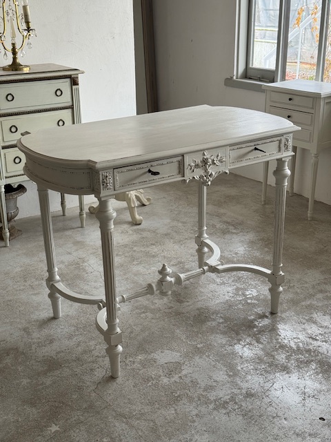 幕板や脚部ストレッチャー部分に至るまで細やかな装飾が随所に施され当時の職人技を感じていただける存在感のあるテーブルとなっています。