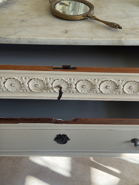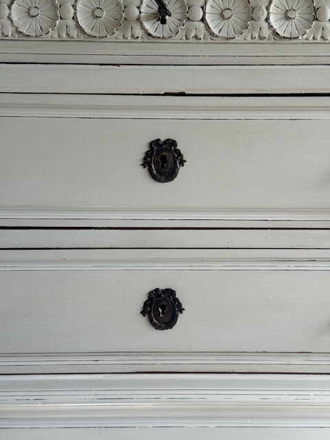 上部には鍵付きの引き出しがあり、開閉が可能です。中央の2段にはリボンモチーフの真鍮製鍵穴が付いており、取っ手部分も同様にリボンの装飾が施されています。