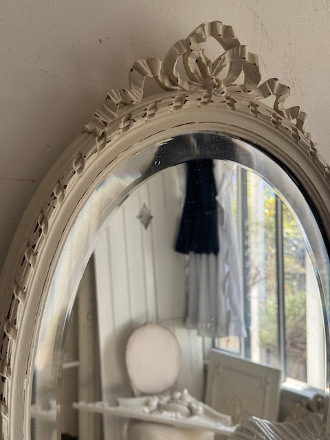 ミラー部分には立体的なリボン装飾が施されており、繊細で優雅な雰囲気を漂わせています。