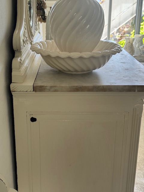 天板には当時の厚みのある大理石が使用されています。19世紀末から20世紀初頭にかけては、蝋燭を使用する際に溶けた蝋が落ちても簡単に拭き取れるよう、大理石が用いられていました。